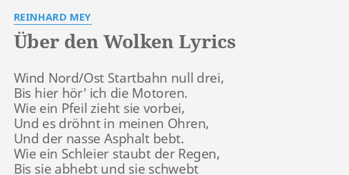Songtekst van UEBER DEN WOLKEN van Reinhard Mey. En het natte asfalt trilt Als een sluier valt de regen. Reinhard Mey - Über den wolken Wind noordoost startbaan nul drie Tot hier hoor ik de motoren.
