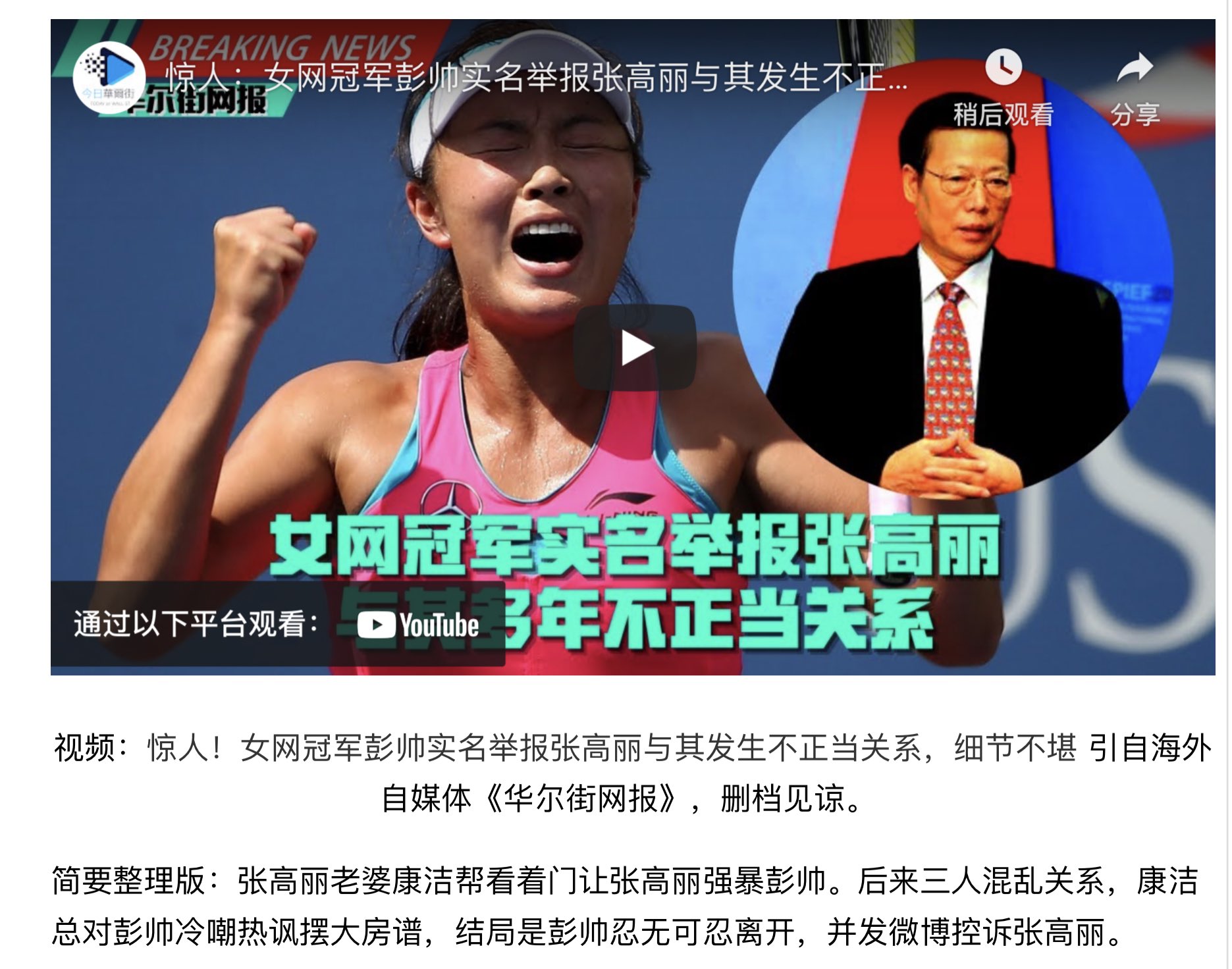 控诉前副总理张高丽强逼性行为中国网球名将彭帅微博贴20分钟被删 We Are United